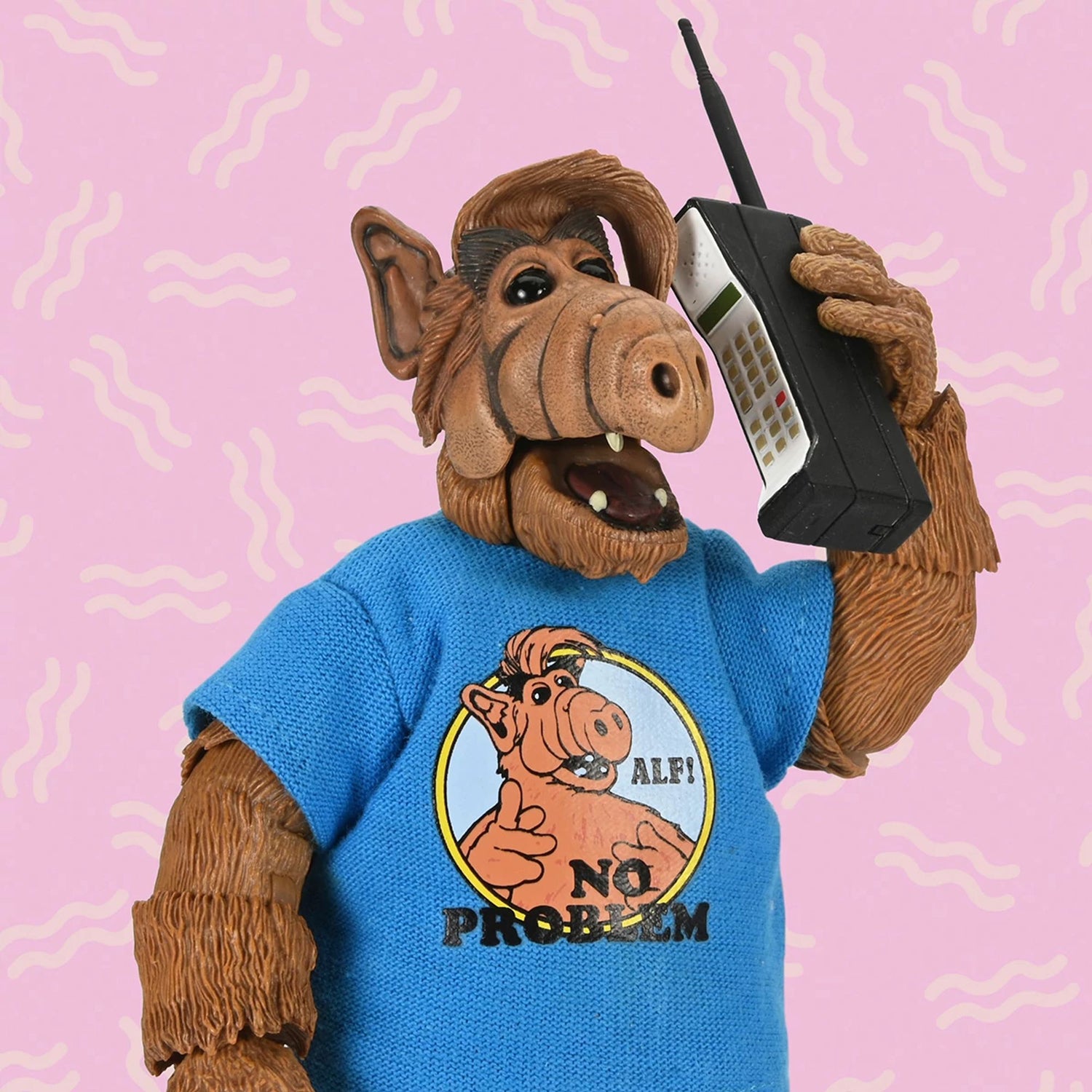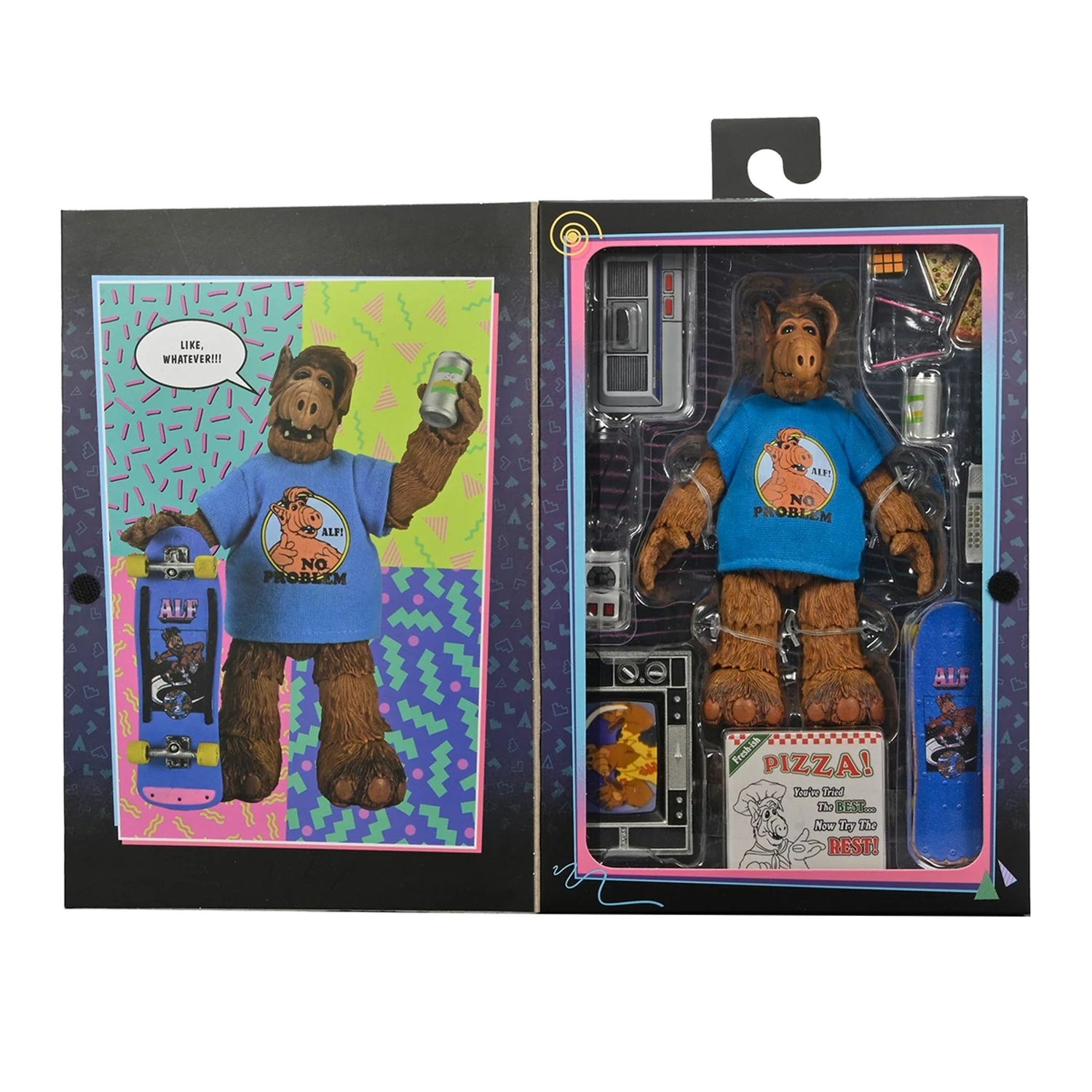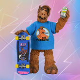 Bring home the favorite visitor from Planet Melmac with this Ultimate ALF action figure! The '80s sitcom, about the misadventures of a grumpy alien hiding in a family's garage after crash-landing on our planet, has influenced a generation. Now, the "Totally 80s" ALF makes his debut as a 7-inch Ultimate action figure. This figure includes interchangeable heads and hands, a puzzle cube, sunglasses, a mobile phone, a video game console with controller, a television, a soda can, a skateboard, and pizza slices with their boxes! It comes in collector-friendly window packaging with an opening flap.