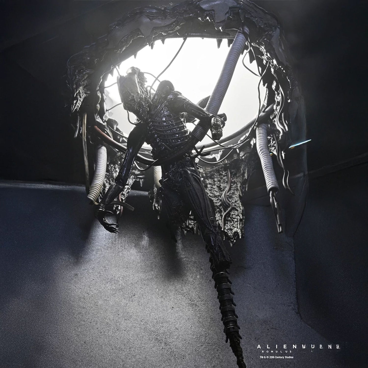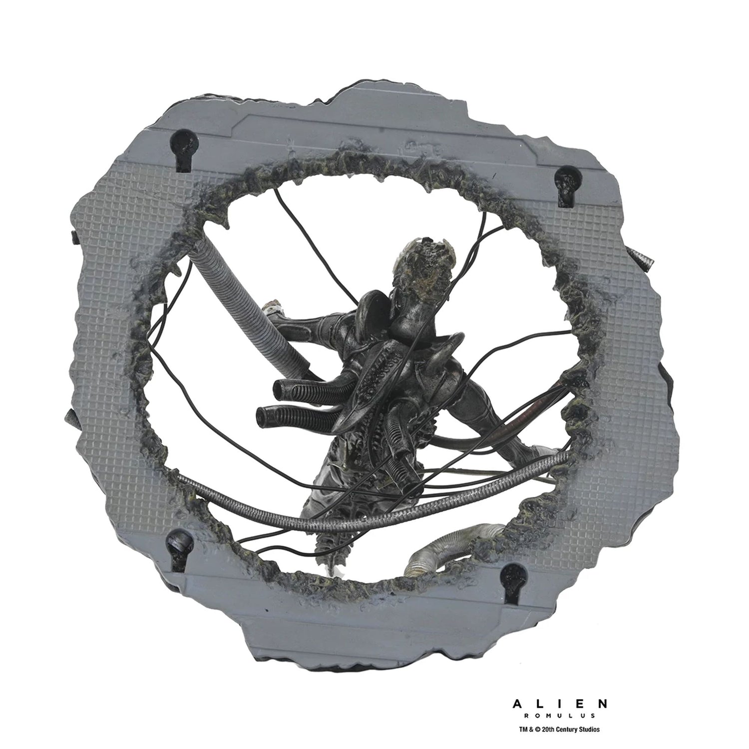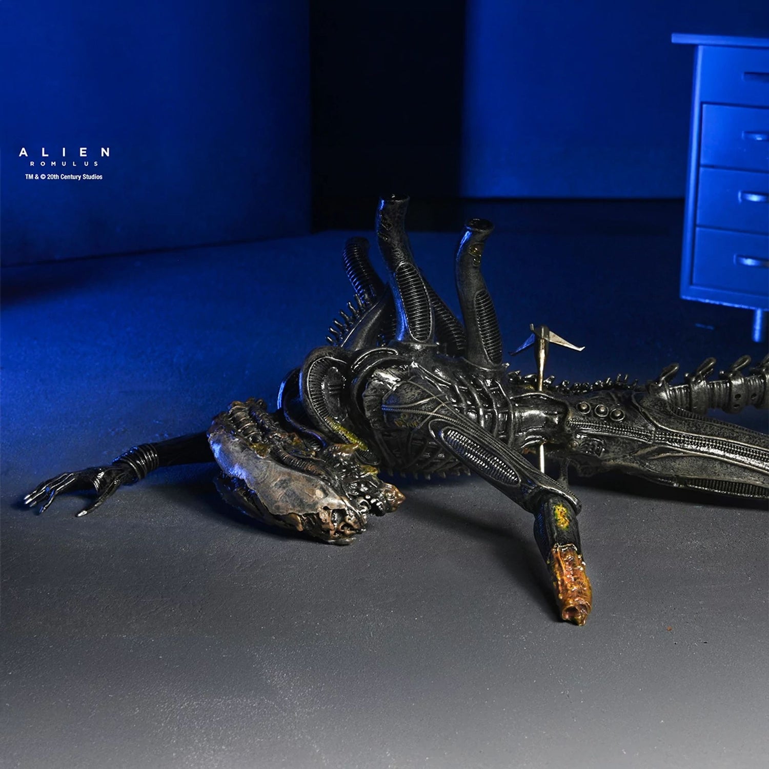 Collector's Edition inspired by Fede Alvarez's blockbuster 2024 film. Straight from the terrifying new chapter of the Alien saga, Alien: Romulus, the legendary Xenomorph returns in a spectacular collector's edition! After a bloody clash with Weyland-Yutani's security forces, the alien creature is found hanging in the ship's laboratory... Its acidic blood, burning the floor, gave scientists direct access to the DNA of the perfect killing machine. This deluxe figure from NECA features this iconic sequence: The mutilated Xenomorph suspended with articulated wires for a realistic levitation effect. Includes a wall decor element depicting the acid-stained laboratory ceiling – attach to the wall or ceiling for a dynamic scene. Ultra-realistic details with articulated jaw, sliding inner jaw, and wire-reinforced tail for varied posing. All presented in a clear collector's display case, perfect for displaying this centerpiece of your Alien: Romulus collection.