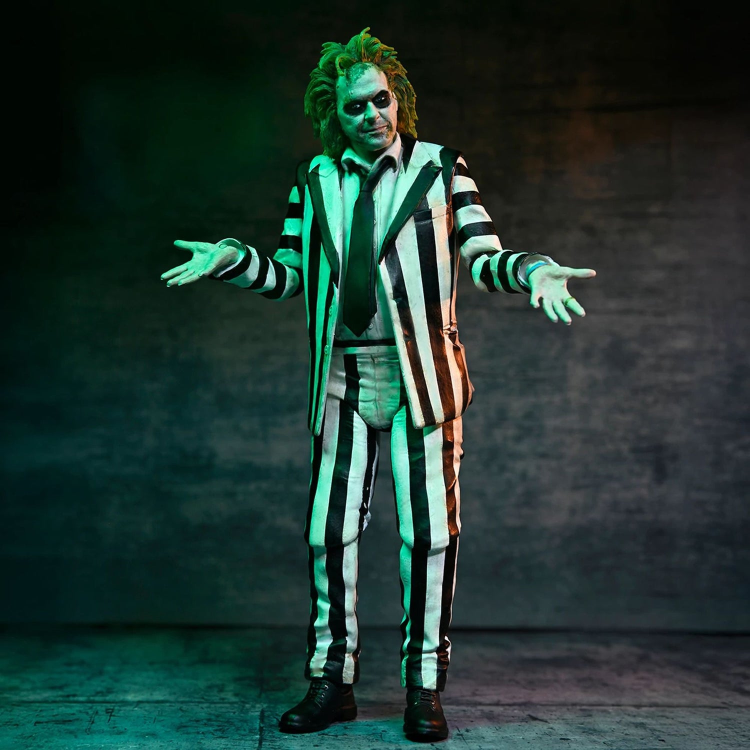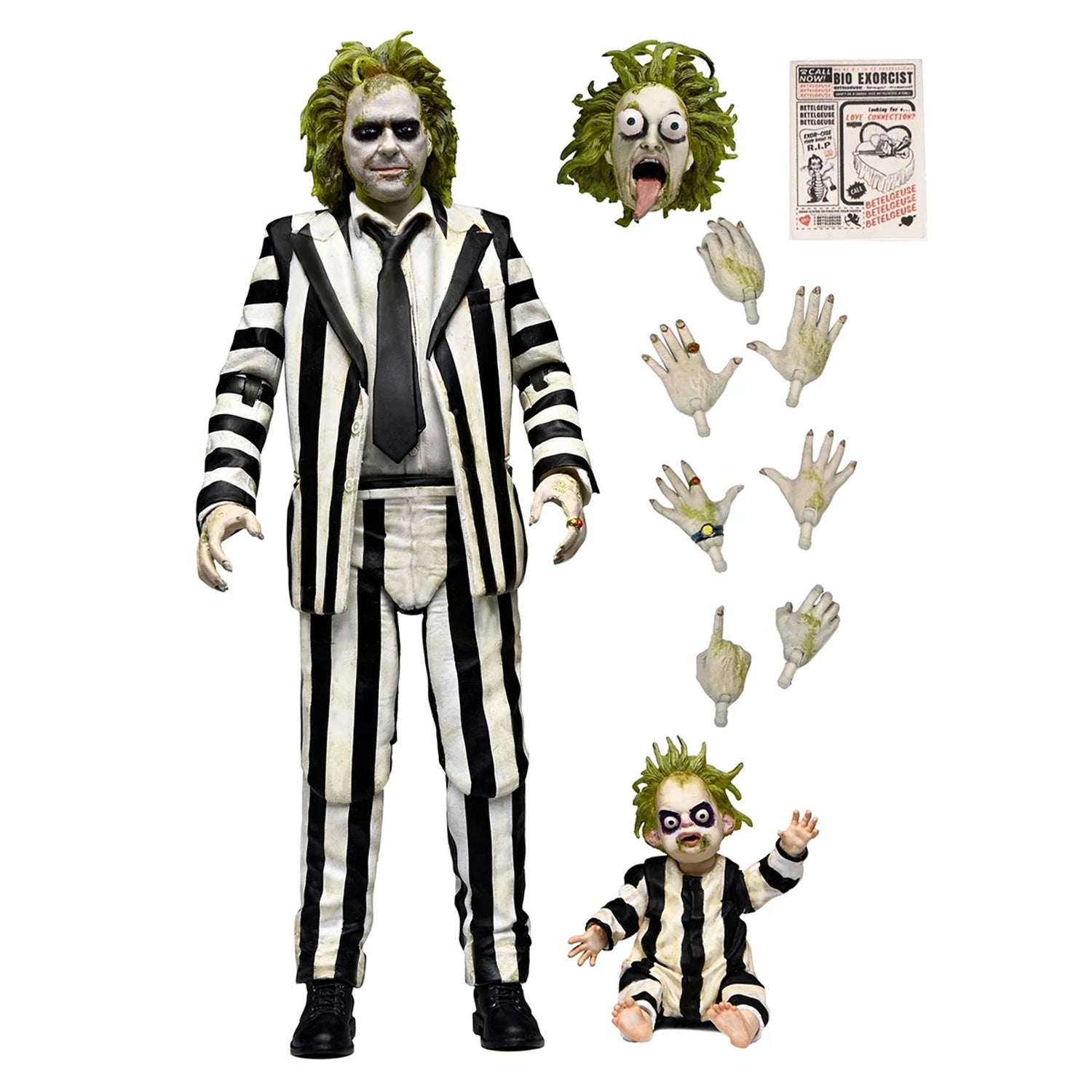 The craziest ghost is back! Inspired by Tim Burton's 2024 film, Beetlejuice, this action figure brings the famous bio-exorcist to life. Now a soul manager in the afterlife, Beetlejuice hatches a new plan to marry Lydia and escape his ex-wife, Delores, in order to return to the world of the living. Includes an 7-inch scale Ultimate Beetlejuice figure with his iconic black and white striped suit. Interchangeable heads and hands, Betelgeuse flyer, and the cute Baby Beetlejuice. Collector's window box packaging with opening flap. Officially licensed Beetlejuice 2 product by NECA.