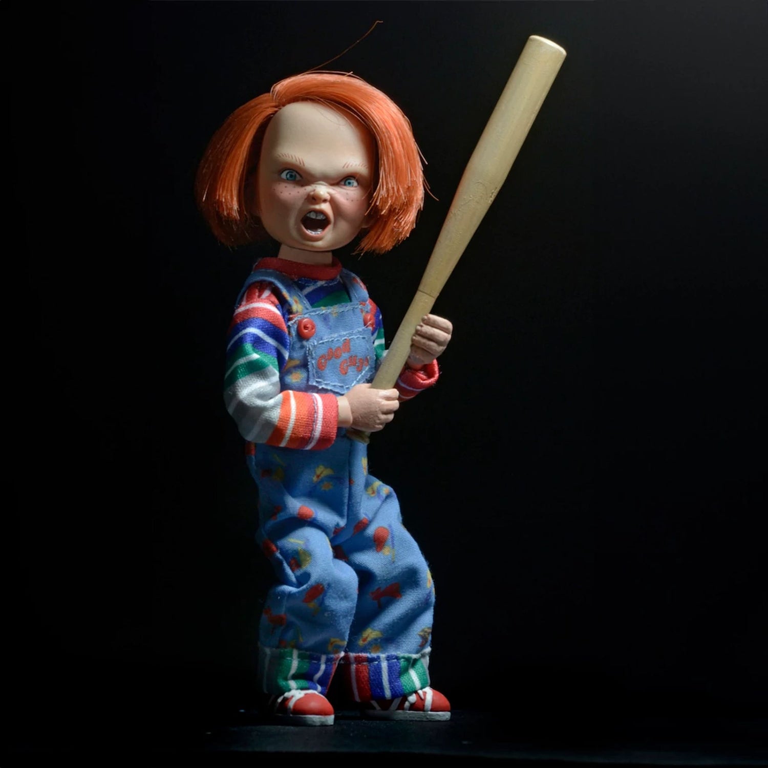 “Inspired by the classic horror films featuring Chucky, the murderous doll inhabited by the soul of a serial killer now comes in the form of an articulated and dressed figure, designed by NECA! Chucky stands approximately 14 centimeters tall and is fully poseable. The figure is dressed in fabric clothing and has implanted hair. She comes with accessories such as a baseball bat, voodoo knife, regular knife and Good Guys hammer. The packaging features artwork by Jason Edmiston! These figures are not children's toys. Intended for adults only."