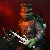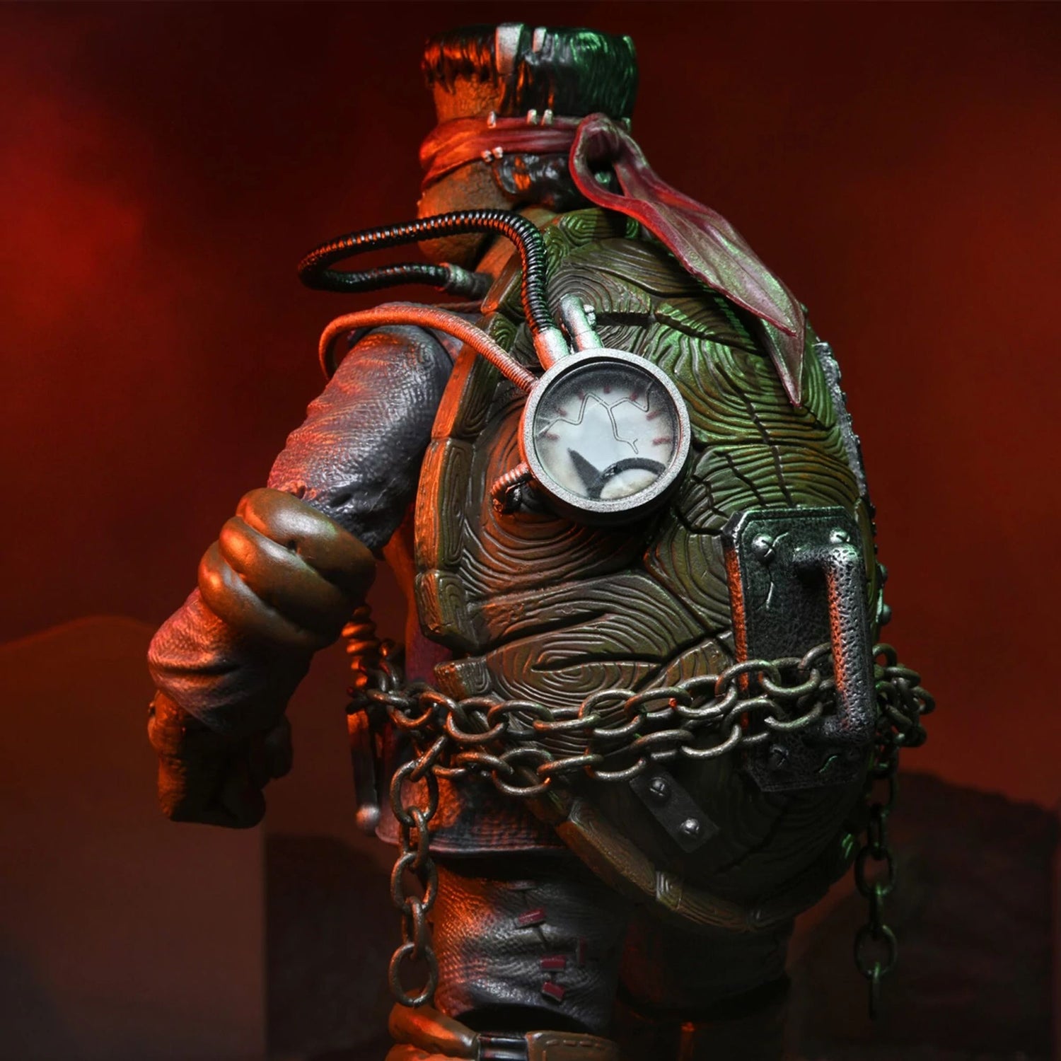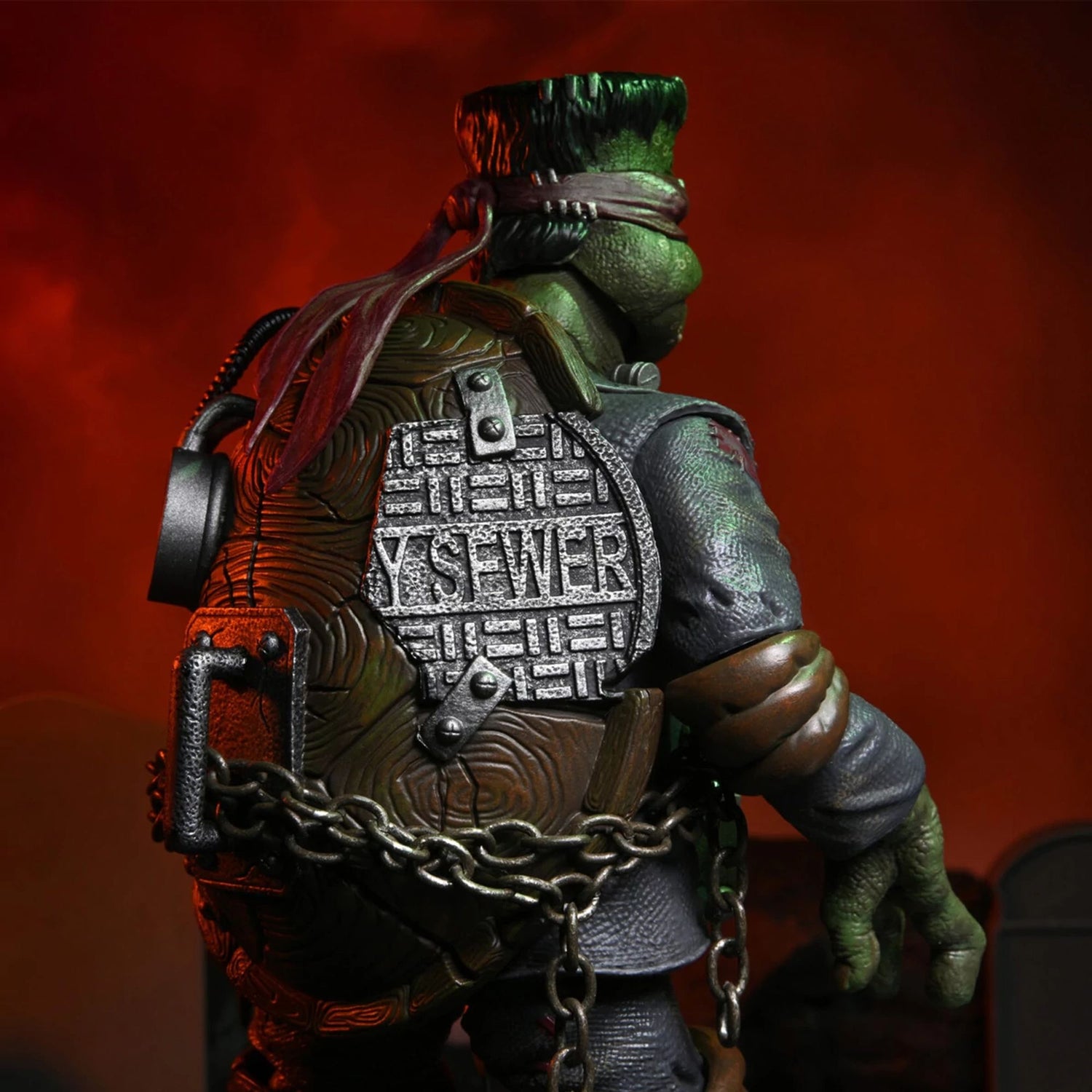 "This spooky season, NECA is excited to announce a new line of 7-inch action figures: Universal Monsters x Teenage Mutant Ninja Turtles! This line will pay homage to the world's most famous turtles and Universal's horror icons. Inspired by the big-screen classic Frankenstein, which celebrates its 90th anniversary in 2021, Raphael as Frankenstein's Monster reimagines the hot-tempered Turtle as a misunderstood monster. Includes a metal chain, interchangeable hands, and two lightning bolt sai. Comes in a collector's window box packaging featuring custom artwork. These figures are not children's toys. Intended for adults only.