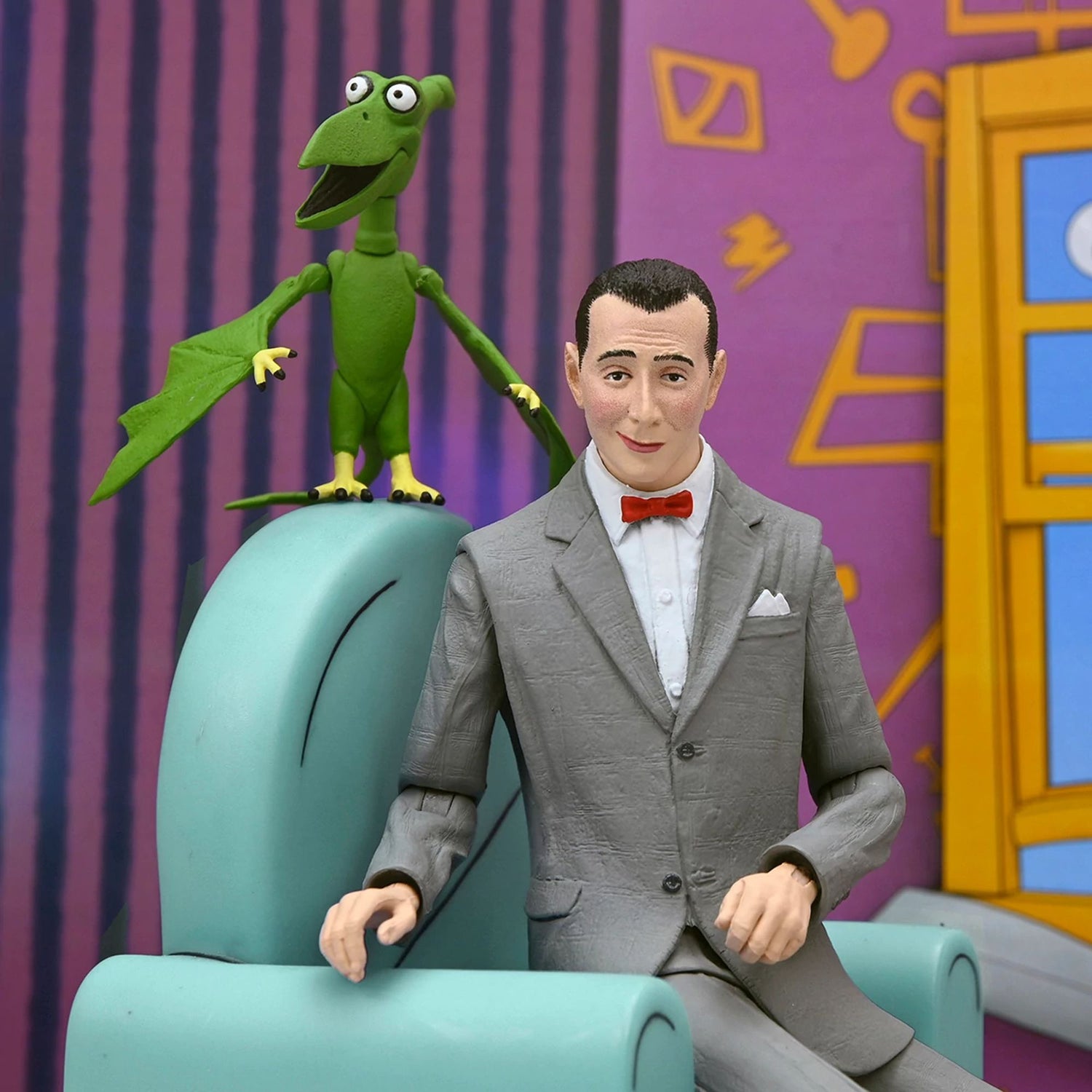 "Ultimate" is the secret word of the day! NECA presents this Ultimate Pee-wee Herman figure, inspired by the popular television show Pee-wee's Playhouse that aired in the late 1980s. At 7 inches (approximately 18 cm) in scale and fully articulated, the figure perfectly captures the quirky personality imagined and embodied by the legendary Paul Reubens. The world of Pee-wee's Playhouse is a whimsical and joyful place populated by toys, gadgets, talking furniture and lots of puppets! The box includes: - 3 interchangeable iconic expressions - Several pairs of hands - The “secret word” papers - His friend Pterri the pterodactyl All presented in a window box with an opening flap, ideal for collectors.