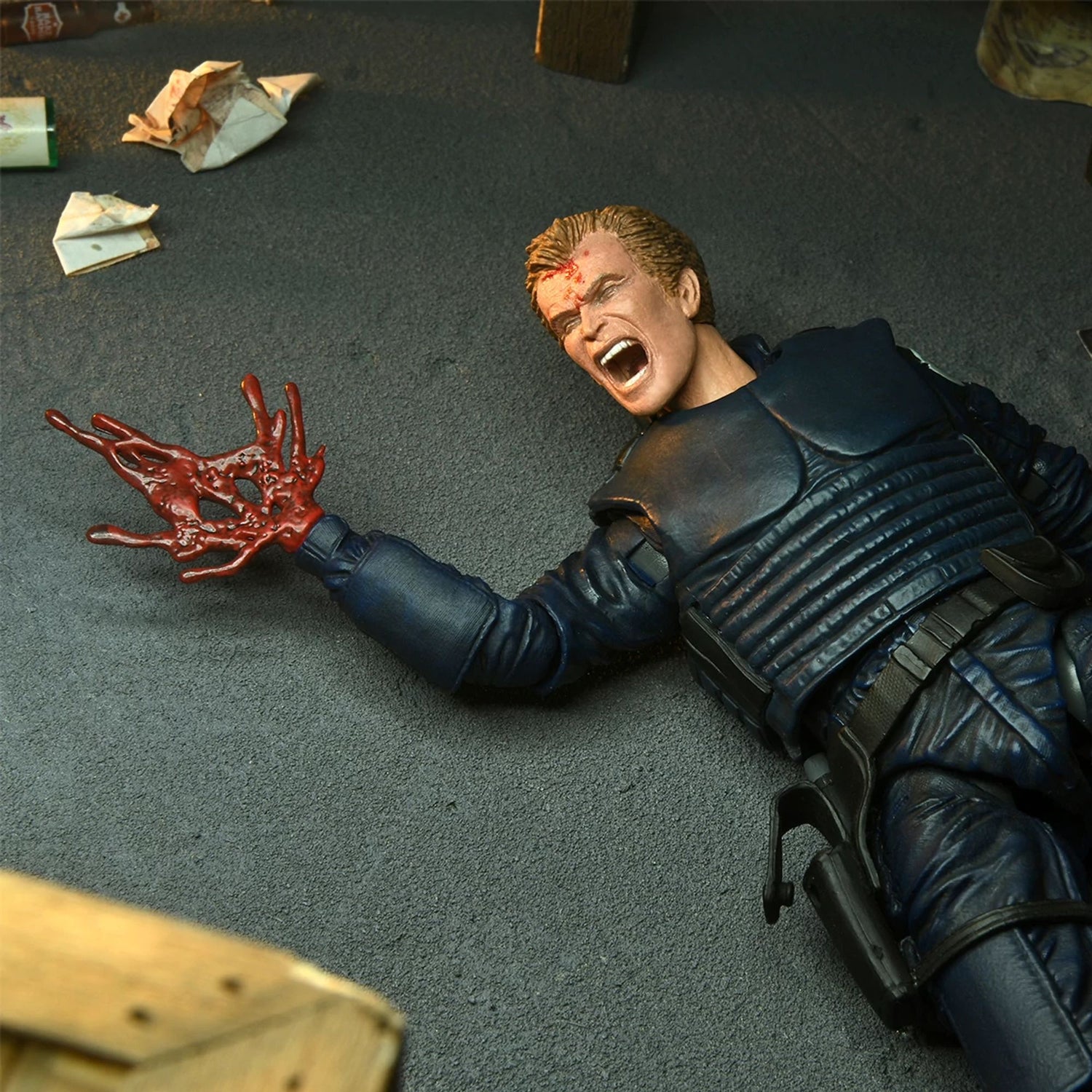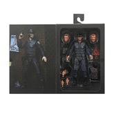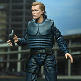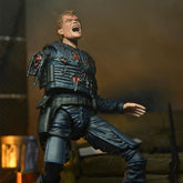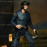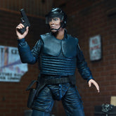 "Before he became a legend, Alex Murphy was a dedicated OCP police officer! Even after his death at the hands of Boddicker's gang, he continues to serve and protect as RoboCop, the law enforcement of the future. This highly articulated Ultimate figure from the cult classic movie comes with a host of accessories: an interchangeable bullet-damaged body armor, a bullet-damaged right arm, a bullet-damaged hand, two side-mounted weapons that fit into a holster, additional hands, and three interchangeable heads (helmeted, unhelmeted, and screaming) featuring the likeness of Peter Weller. The 7-inch-high figure comes packaged in a window box for collectors. These figures are not toys for children. Intended for adults only."